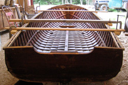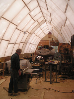 His shop accommodates boats up to 35 feet in length. He prefers to work with natural, renewable materials because he wants boatbuilding to become more biodegradeable. Most of the time you'll find Pete barefoot with classical, bluegrass, or Celtic music playing on the FM radio.